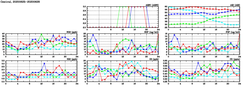 | Air Quality Data Time Series in Central (2020/06/28) | ( Line colors: Day -3 Day -2 Day -1 Current day ) | 2D Map Current AQHI |