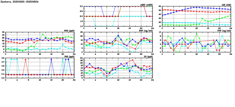 | Air Quality Data Time Series in Eastern (2020/06/24) | ( Line colors: Day -3 Day -2 Day -1 Current day ) | 2D Map Current AQHI |
