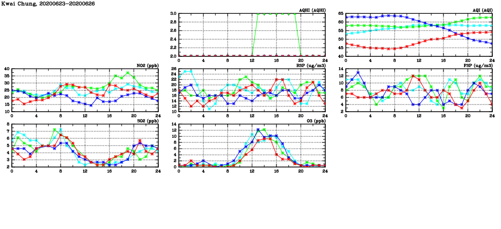 | Air Quality Data Time Series in Kwai Chung (2020/06/26) | ( Line colors: Day -3 Day -2 Day -1 Current day ) | 2D Map Current AQHI |