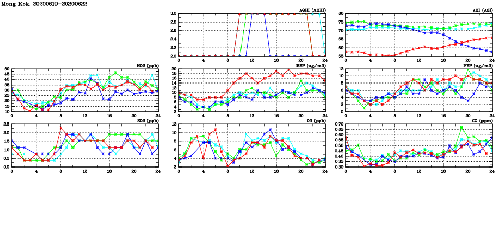 | Air Quality Data Time Series in Mong Kok (2020/06/22) | ( Line colors: Day -3 Day -2 Day -1 Current day ) | 2D Map Current AQHI |