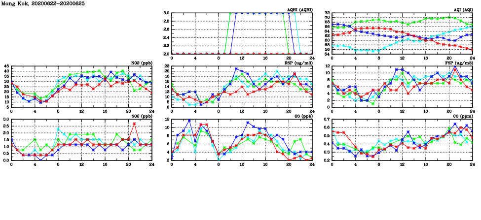 | Air Quality Data Time Series in Mong Kok (2020/06/25) | ( Line colors: Day -3 Day -2 Day -1 Current day ) | 2D Map Current AQHI |