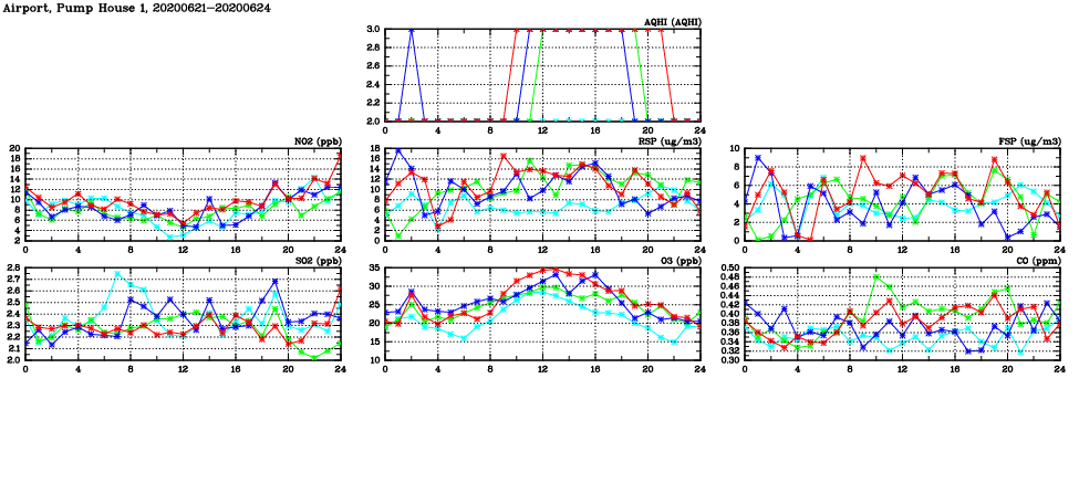 | Air Quality Data Time Series in Airport, Pump House 1 (2020/06/24) | ( Line colors: Day -3 Day -2 Day -1 Current day ) | 2D Map Current AQHI |