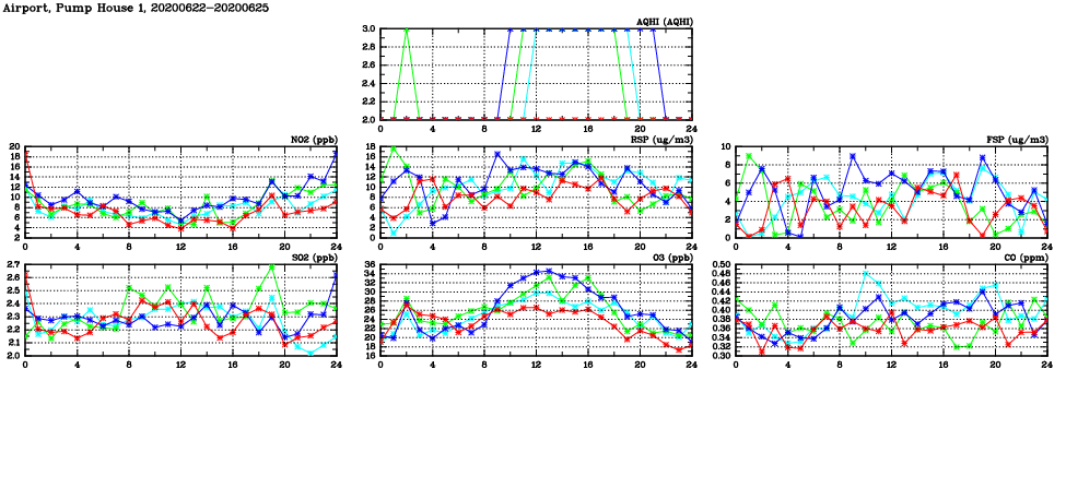 | Air Quality Data Time Series in Airport, Pump House 1 (2020/06/25) | ( Line colors: Day -3 Day -2 Day -1 Current day ) | 2D Map Current AQHI |