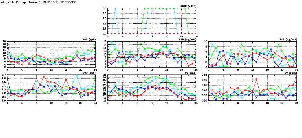 | Air Quality Data Time Series in Airport, Pump House 1 (2020/06/26) | ( Line colors: Day -3 Day -2 Day -1 Current day ) | 2D Map Current AQHI |