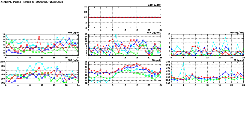 | Air Quality Data Time Series in Airport, Pump House 5 (2020/06/23) | ( Line colors: Day -3 Day -2 Day -1 Current day ) | 2D Map Current AQHI |