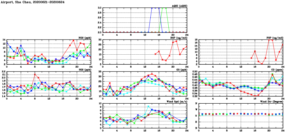 | Air Quality Data Time Series in Airport, Sha Chau (2020/06/24) | ( Line colors: Day -3 Day -2 Day -1 Current day ) | 2D Map Current AQHI |