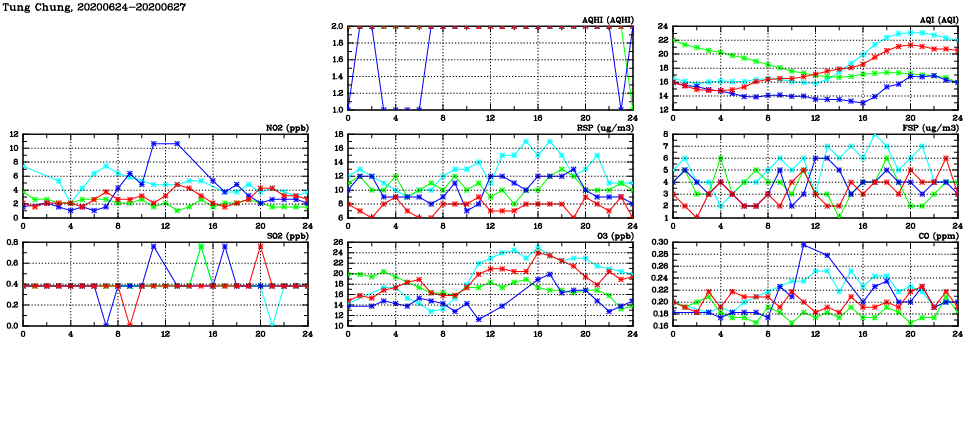 | Air Quality Data Time Series in Tung Chung (2020/06/27) | ( Line colors: Day -3 Day -2 Day -1 Current day ) | 2D Map Current AQHI |