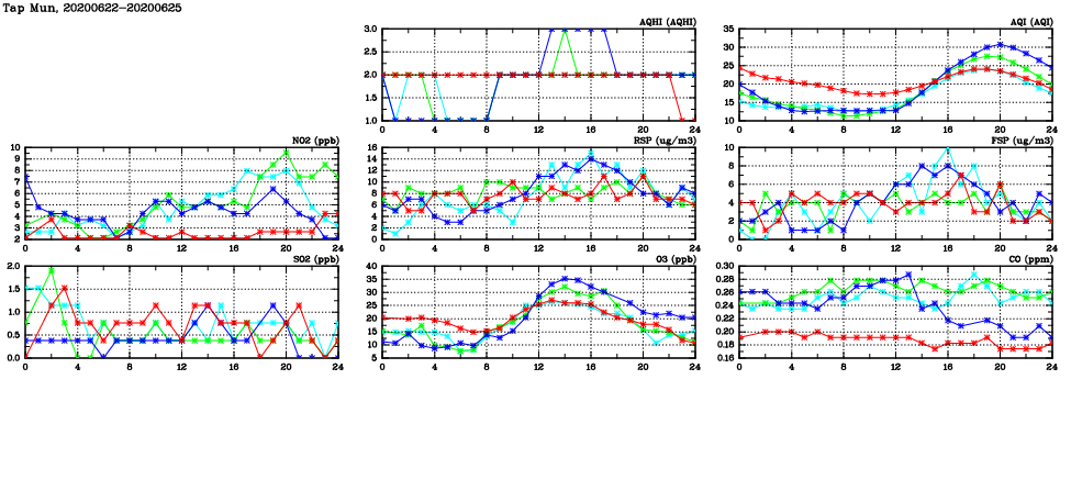 | Air Quality Data Time Series in Tap Mun (2020/06/25) | ( Line colors: Day -3 Day -2 Day -1 Current day ) | 2D Map Current AQHI |