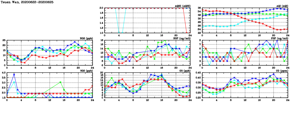 | Air Quality Data Time Series in Tsuen Wan (2020/06/25) | ( Line colors: Day -3 Day -2 Day -1 Current day ) | 2D Map Current AQHI |