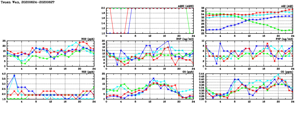 | Air Quality Data Time Series in Tsuen Wan (2020/06/27) | ( Line colors: Day -3 Day -2 Day -1 Current day ) | 2D Map Current AQHI |