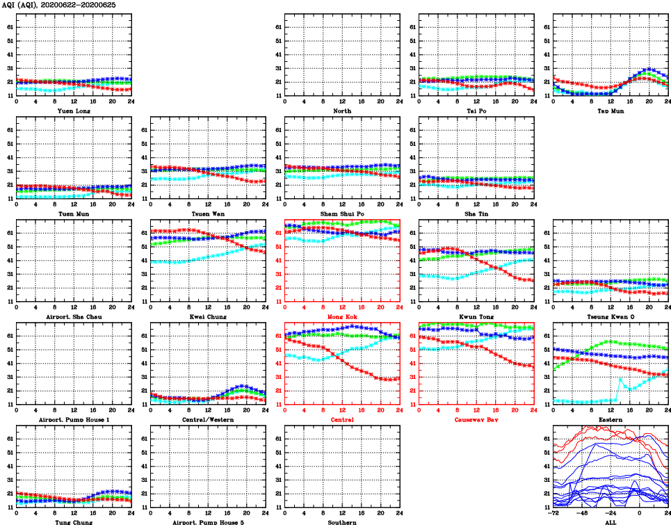 | Air Quality Data Time Series for AQI (2020/06/25) | ( Line colors: Day -3 Day -2 Day -1 Current day ) | 2D Map Current AQHI |