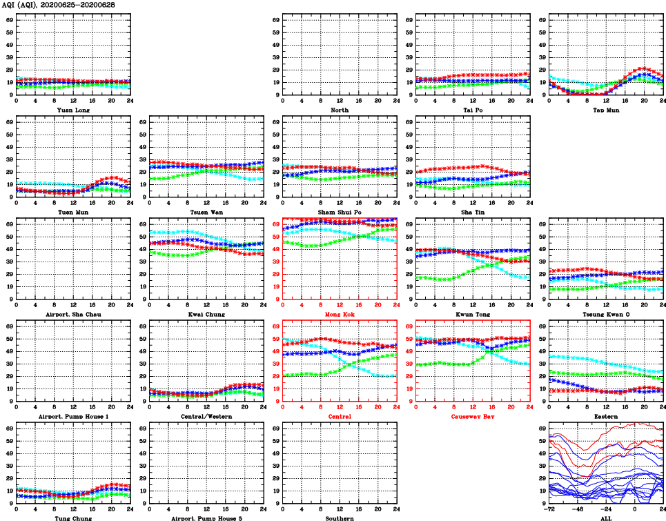 | Air Quality Data Time Series for AQI (2020/06/28) | ( Line colors: Day -3 Day -2 Day -1 Current day ) | 2D Map Current AQHI |