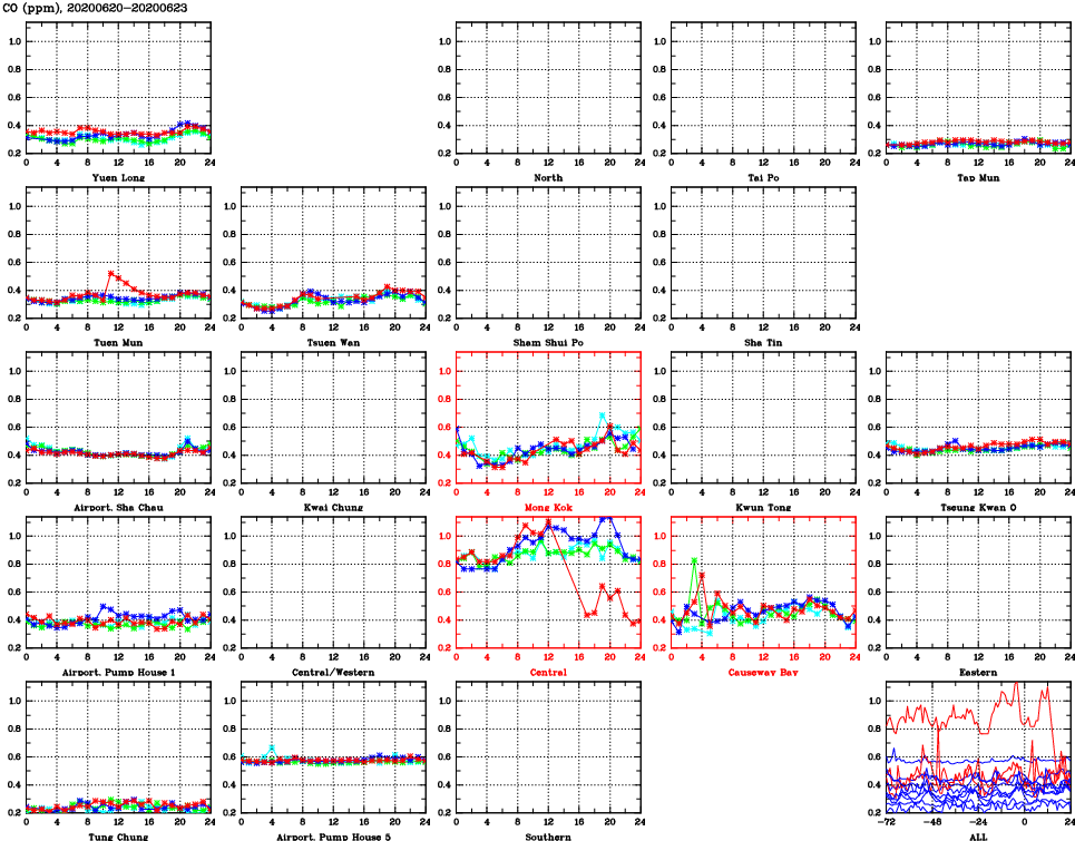 | Air Quality Data Time Series for CO (2020/06/23) | ( Line colors: Day -3 Day -2 Day -1 Current day ) | 2D Map Current AQHI |