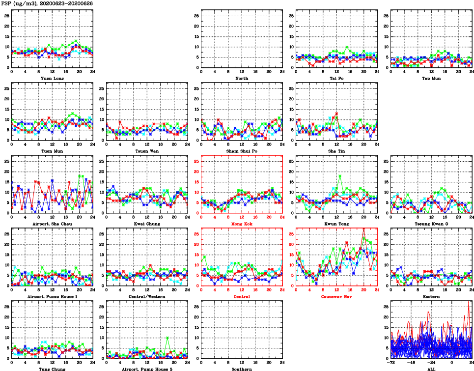 | Air Quality Data Time Series for FSP (2020/06/26) | ( Line colors: Day -3 Day -2 Day -1 Current day ) | 2D Map Current AQHI |