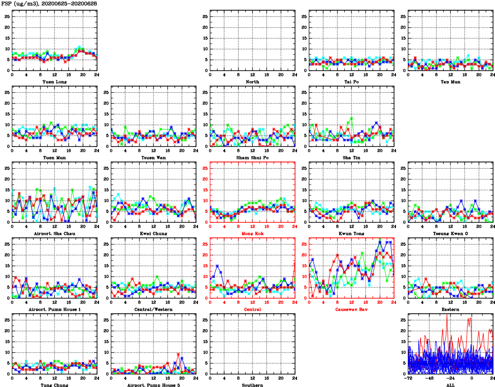 | Air Quality Data Time Series for FSP (2020/06/28) | ( Line colors: Day -3 Day -2 Day -1 Current day ) | 2D Map Current AQHI |