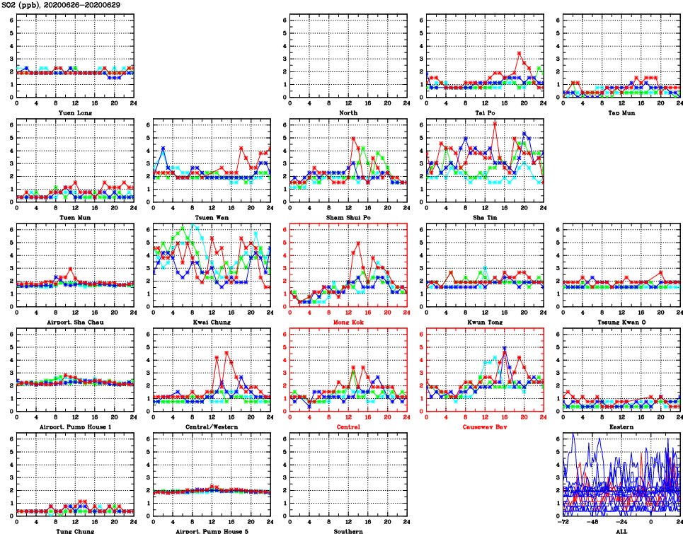 | Air Quality Data Time Series for SO2 (2020/06/29) | ( Line colors: Day -3 Day -2 Day -1 Current day ) | 2D Map Current AQHI |