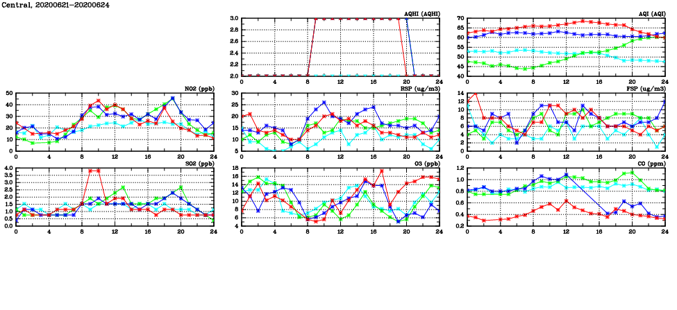 | Air Quality Data Time Series in Central (2020/06/24) | ( Line colors: Day -3 Day -2 Day -1 Current day ) | 2D Map Current AQHI |