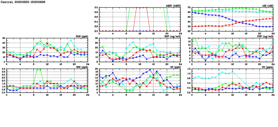 | Air Quality Data Time Series in Central (2020/06/26) | ( Line colors: Day -3 Day -2 Day -1 Current day ) | 2D Map Current AQHI |