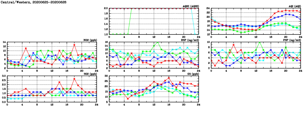 | Air Quality Data Time Series in Central/Western (2020/06/28) | ( Line colors: Day -3 Day -2 Day -1 Current day ) | 2D Map Current AQHI |