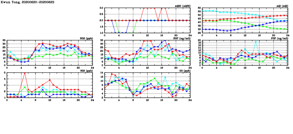 | Air Quality Data Time Series in Kwun Tong (2020/06/23) | ( Line colors: Day -3 Day -2 Day -1 Current day ) | 2D Map Current AQHI |