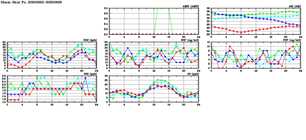 | Air Quality Data Time Series in Sham Shui Po (2020/06/26) | ( Line colors: Day -3 Day -2 Day -1 Current day ) | 2D Map Current AQHI |