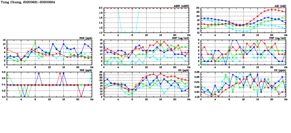 | Air Quality Data Time Series in Tung Chung (2020/06/24) | ( Line colors: Day -3 Day -2 Day -1 Current day ) | 2D Map Current AQHI |