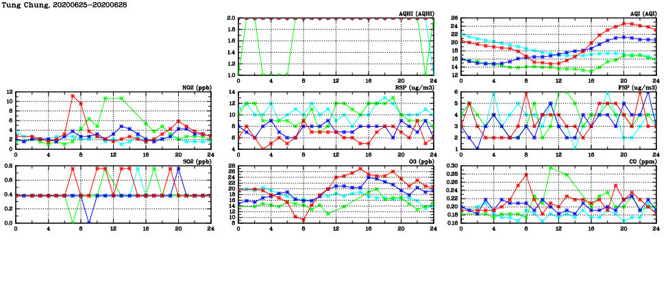 | Air Quality Data Time Series in Tung Chung (2020/06/28) | ( Line colors: Day -3 Day -2 Day -1 Current day ) | 2D Map Current AQHI |