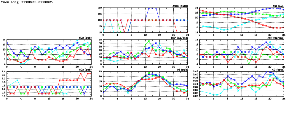 | Air Quality Data Time Series in Yuen Long (2020/06/25) | ( Line colors: Day -3 Day -2 Day -1 Current day ) | 2D Map Current AQHI |