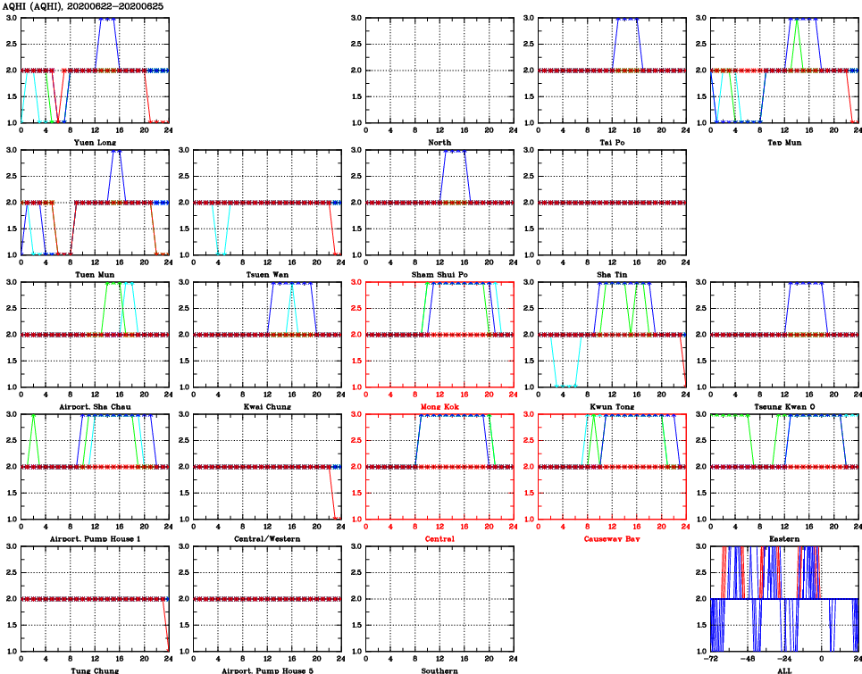 | Air Quality Data Time Series for AQHI (2020/06/25) | ( Line colors: Day -3 Day -2 Day -1 Current day ) | 2D Map Current AQHI |