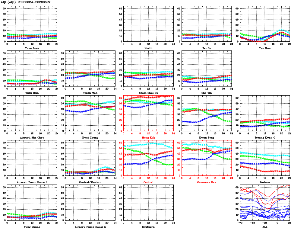 | Air Quality Data Time Series for AQI (2020/06/27) | ( Line colors: Day -3 Day -2 Day -1 Current day ) | 2D Map Current AQHI |