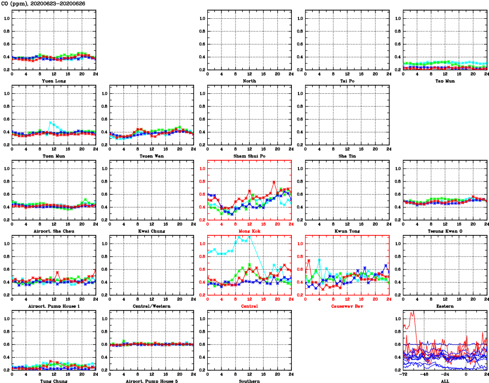 | Air Quality Data Time Series for CO (2020/06/26) | ( Line colors: Day -3 Day -2 Day -1 Current day ) | 2D Map Current AQHI |