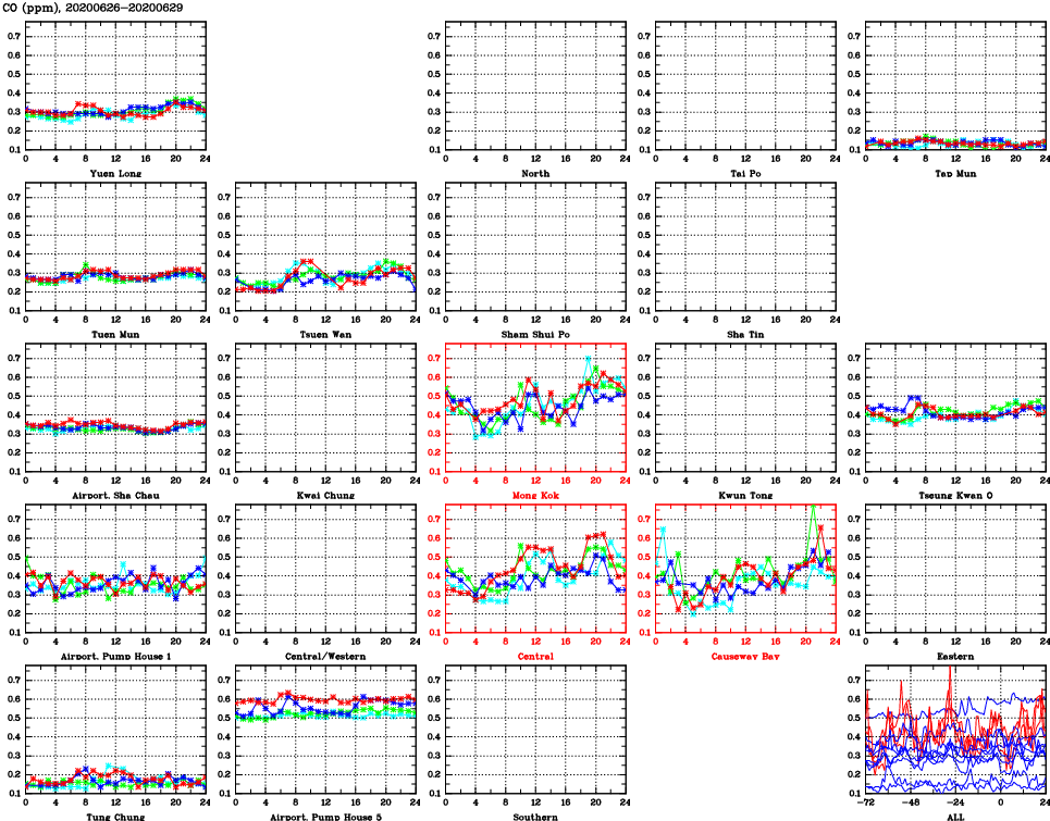| Air Quality Data Time Series for CO (2020/06/29) | ( Line colors: Day -3 Day -2 Day -1 Current day ) | 2D Map Current AQHI |