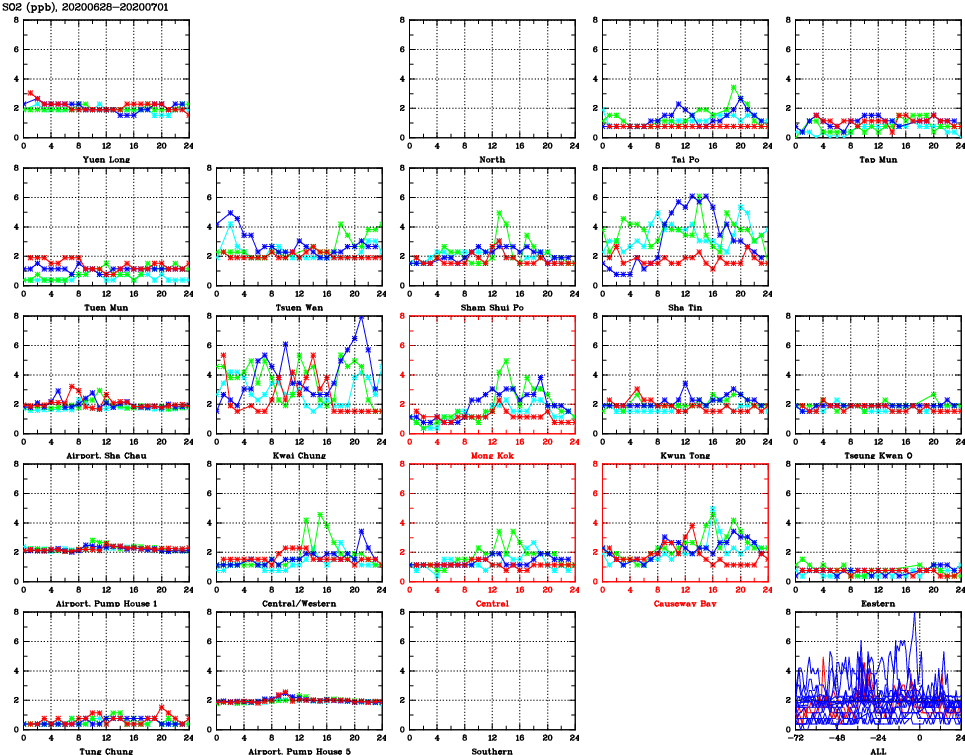 | Air Quality Data Time Series for SO2 (2020/07/01) | ( Line colors: Day -3 Day -2 Day -1 Current day ) | 2D Map Current AQHI |