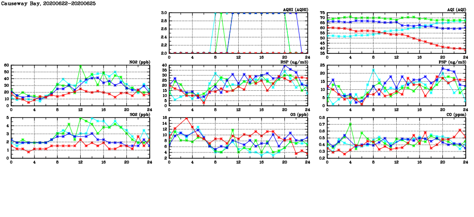 | Air Quality Data Time Series in Causeway Bay (2020/06/25) | ( Line colors: Day -3 Day -2 Day -1 Current day ) | 2D Map Current AQHI |