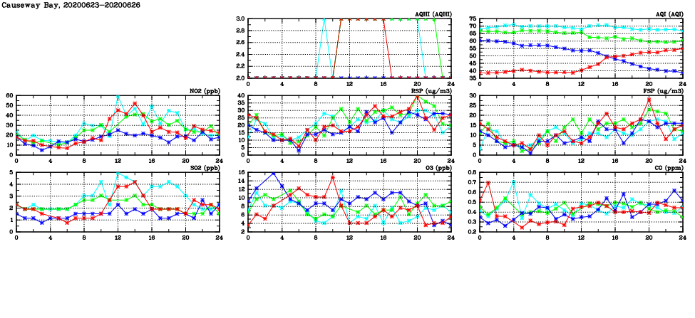 | Air Quality Data Time Series in Causeway Bay (2020/06/26) | ( Line colors: Day -3 Day -2 Day -1 Current day ) | 2D Map Current AQHI |