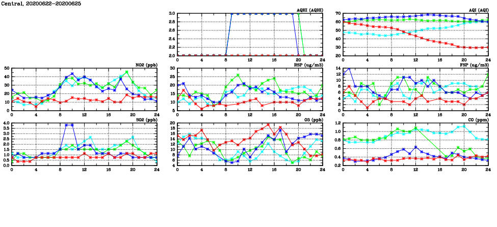 | Air Quality Data Time Series in Central (2020/06/25) | ( Line colors: Day -3 Day -2 Day -1 Current day ) | 2D Map Current AQHI |