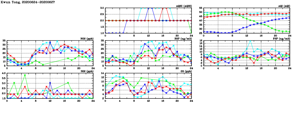 | Air Quality Data Time Series in Kwun Tong (2020/06/27) | ( Line colors: Day -3 Day -2 Day -1 Current day ) | 2D Map Current AQHI |
