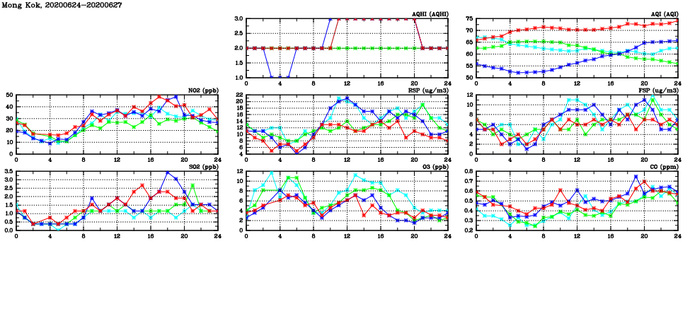 | Air Quality Data Time Series in Mong Kok (2020/06/27) | ( Line colors: Day -3 Day -2 Day -1 Current day ) | 2D Map Current AQHI |