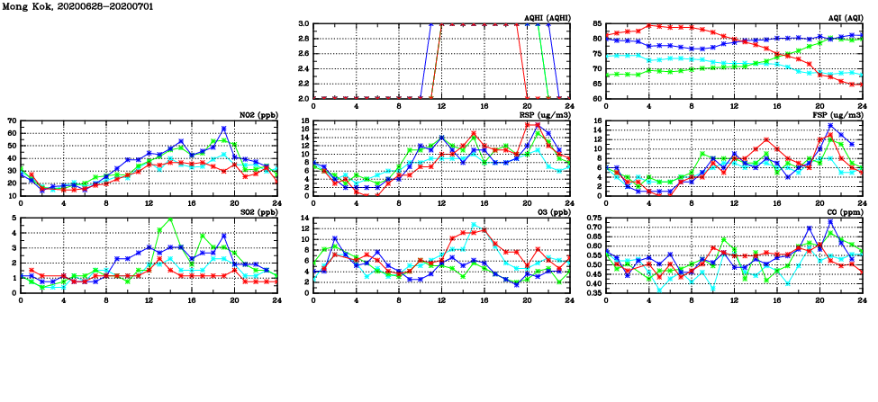 | Air Quality Data Time Series in Mong Kok (2020/07/01) | ( Line colors: Day -3 Day -2 Day -1 Current day ) | 2D Map Current AQHI |