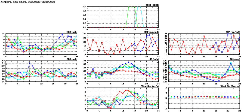 | Air Quality Data Time Series in Airport, Sha Chau (2020/06/25) | ( Line colors: Day -3 Day -2 Day -1 Current day ) | 2D Map Current AQHI |