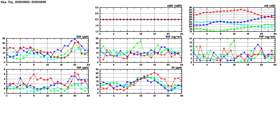 | Air Quality Data Time Series in Sha Tin (2020/06/28) | ( Line colors: Day -3 Day -2 Day -1 Current day ) | 2D Map Current AQHI |