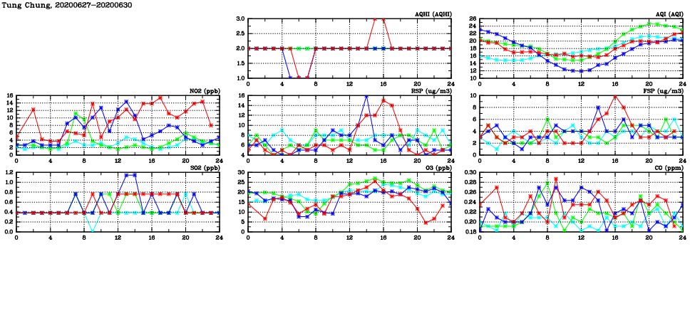 | Air Quality Data Time Series in Tung Chung (2020/06/30) | ( Line colors: Day -3 Day -2 Day -1 Current day ) | 2D Map Current AQHI |