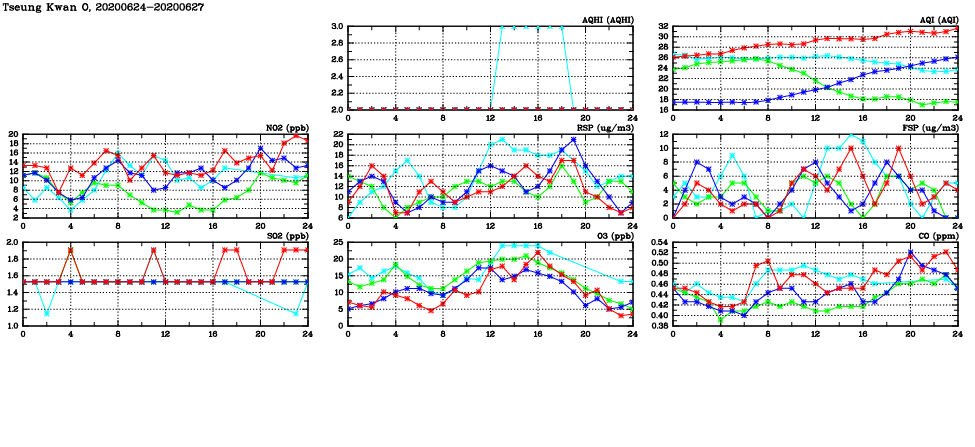 | Air Quality Data Time Series in Tseung Kwan O (2020/06/27) | ( Line colors: Day -3 Day -2 Day -1 Current day ) | 2D Map Current AQHI |