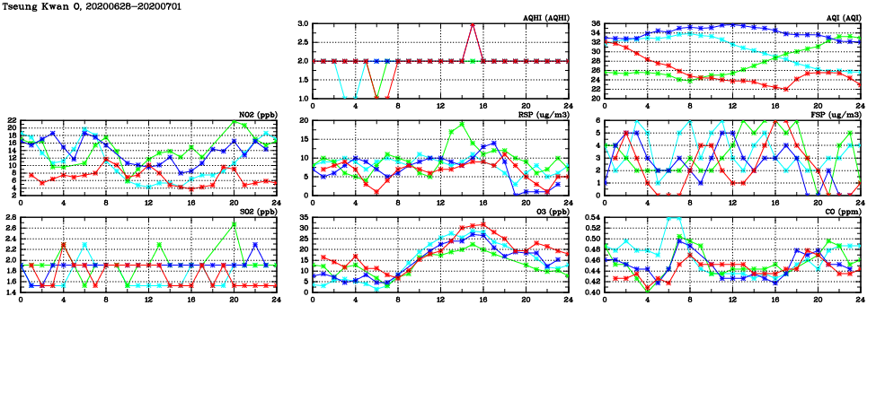 | Air Quality Data Time Series in Tseung Kwan O (2020/07/01) | ( Line colors: Day -3 Day -2 Day -1 Current day ) | 2D Map Current AQHI |