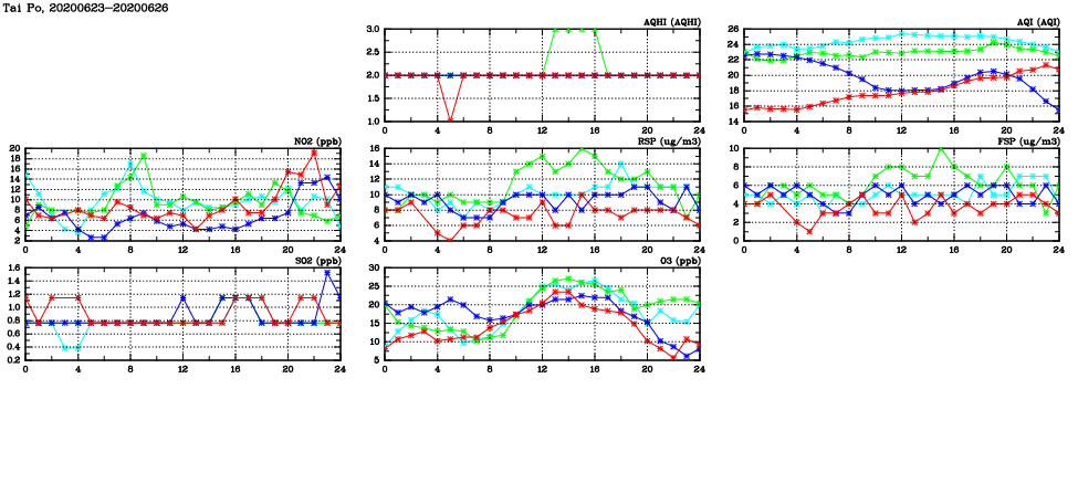 | Air Quality Data Time Series in Tai Po (2020/06/26) | ( Line colors: Day -3 Day -2 Day -1 Current day ) | 2D Map Current AQHI |