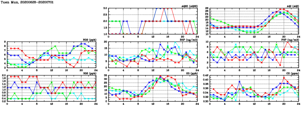 | Air Quality Data Time Series in Tuen Mun (2020/07/01) | ( Line colors: Day -3 Day -2 Day -1 Current day ) | 2D Map Current AQHI |