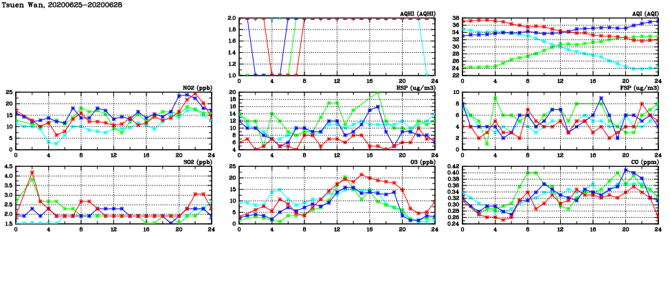 | Air Quality Data Time Series in Tsuen Wan (2020/06/28) | ( Line colors: Day -3 Day -2 Day -1 Current day ) | 2D Map Current AQHI |