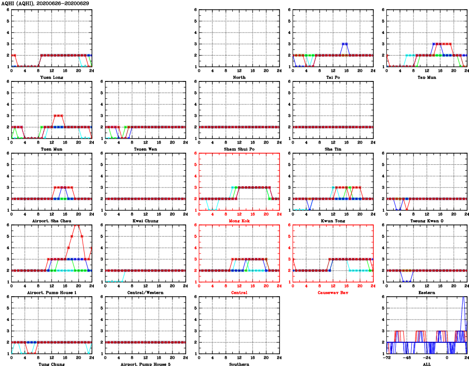 | Air Quality Data Time Series for AQHI (2020/06/29) | ( Line colors: Day -3 Day -2 Day -1 Current day ) | 2D Map Current AQHI |