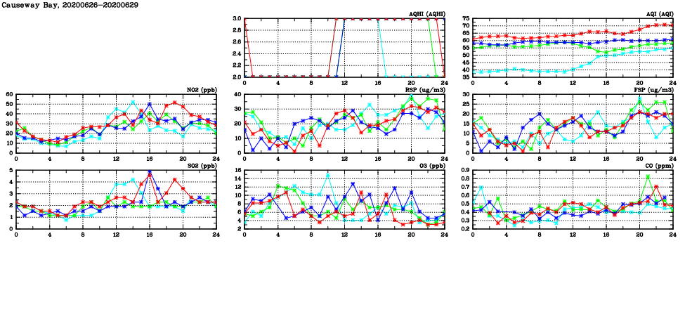 | Air Quality Data Time Series in Causeway Bay (2020/06/29) | ( Line colors: Day -3 Day -2 Day -1 Current day ) | 2D Map Current AQHI |