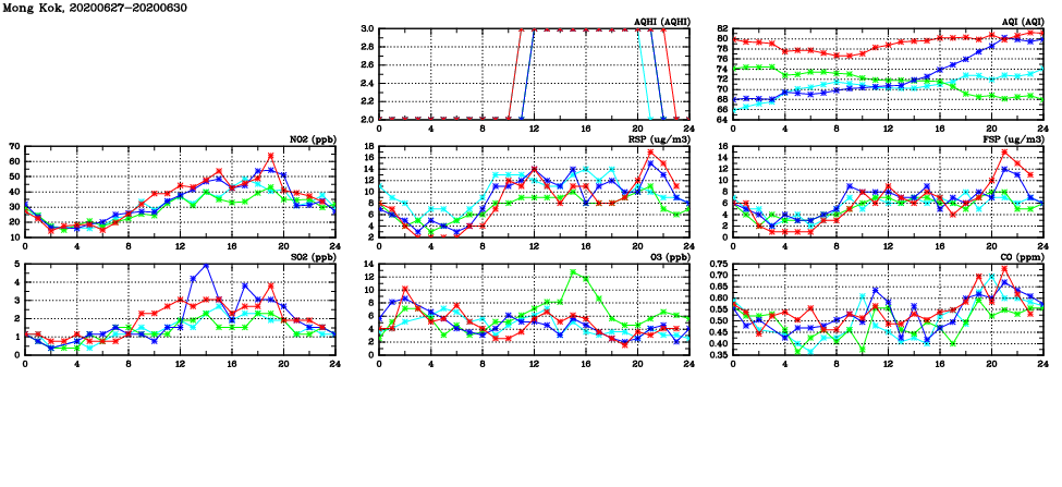 | Air Quality Data Time Series in Mong Kok (2020/06/30) | ( Line colors: Day -3 Day -2 Day -1 Current day ) | 2D Map Current AQHI |